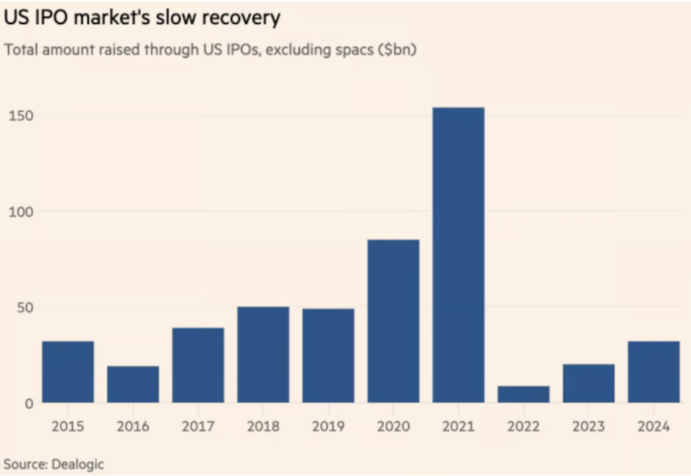 US IPOs raised $32 billion in 2024, a 60% increase from 2023 but still below the 2021 peak of $150 billion, with hopes to exceed the pre-2020 annual average of $38 billion
