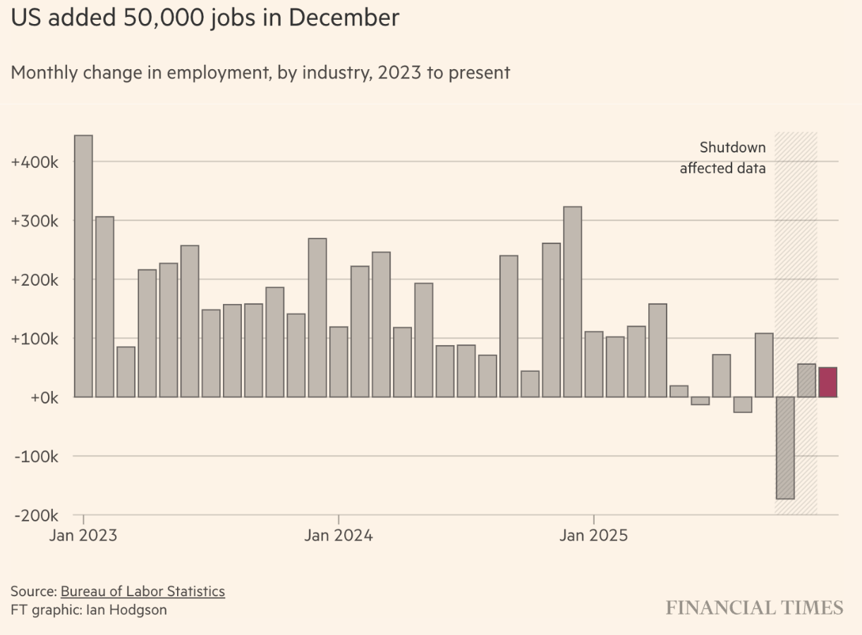 US economy undershoots expectations to add just 50,000 jobs in December (Financial Times, 2 minute read)