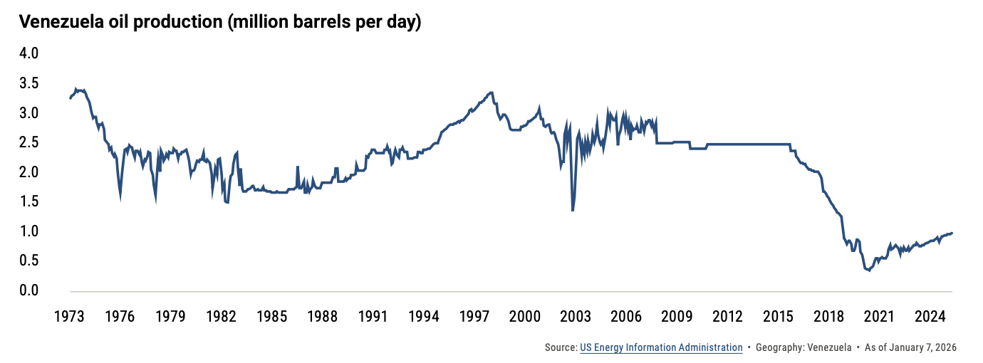 Venezuela’s political shock has reopened access to the world’s largest oil reserves (303 billion barrels, 17% of global total), but the investment case remains challenging. Production could rise from 800–900 thousand barrels of oil per day (kb/d) to 1.5–2 million barrels of oil per day (mb/d) near term, yet returning to historical peaks of ~3.5 mb/d would require $100 billion+ and years of rebuilding degraded infrastructure. Most reserves are extra-heavy crude, with production costs of $70–$80 per barrel, above current oil prices and costlier than Canadian alternatives, limiting near-term investor appeal. For global markets, increased Venezuelan heavy crude flows to US Gulf Coast refineries could pressure Canadian heavy oil prices, deepening existing discounts