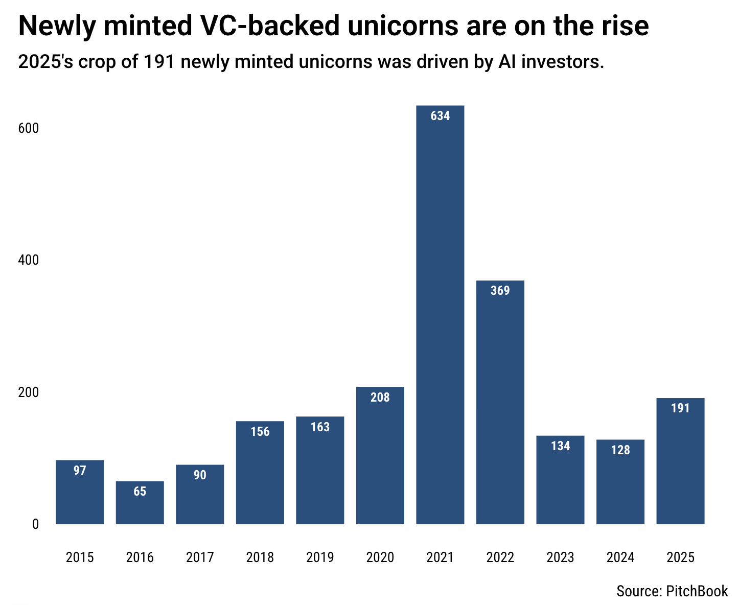 VCs minted more new unicorns in 2025 (PitchBook, 3 minute read)
