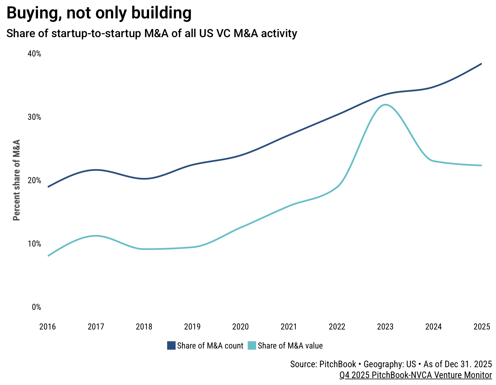 Startup-to-startup M&A hit record levels in 2025, accounting for 38.4% of all acquisitions of U.S. VC-backed companies, according to PitchBook-NVCA. Of 1,009 total M&A deals, 387 involved VC-backed buyers, representing $31.1 billion of the year’s $139.1 billion in deal value, the highest since 2021. The trend reflects fast-growing, well-capitalized startups, many in AI, using acquisitions to stay competitive, absorb talent, and extend product capabilities