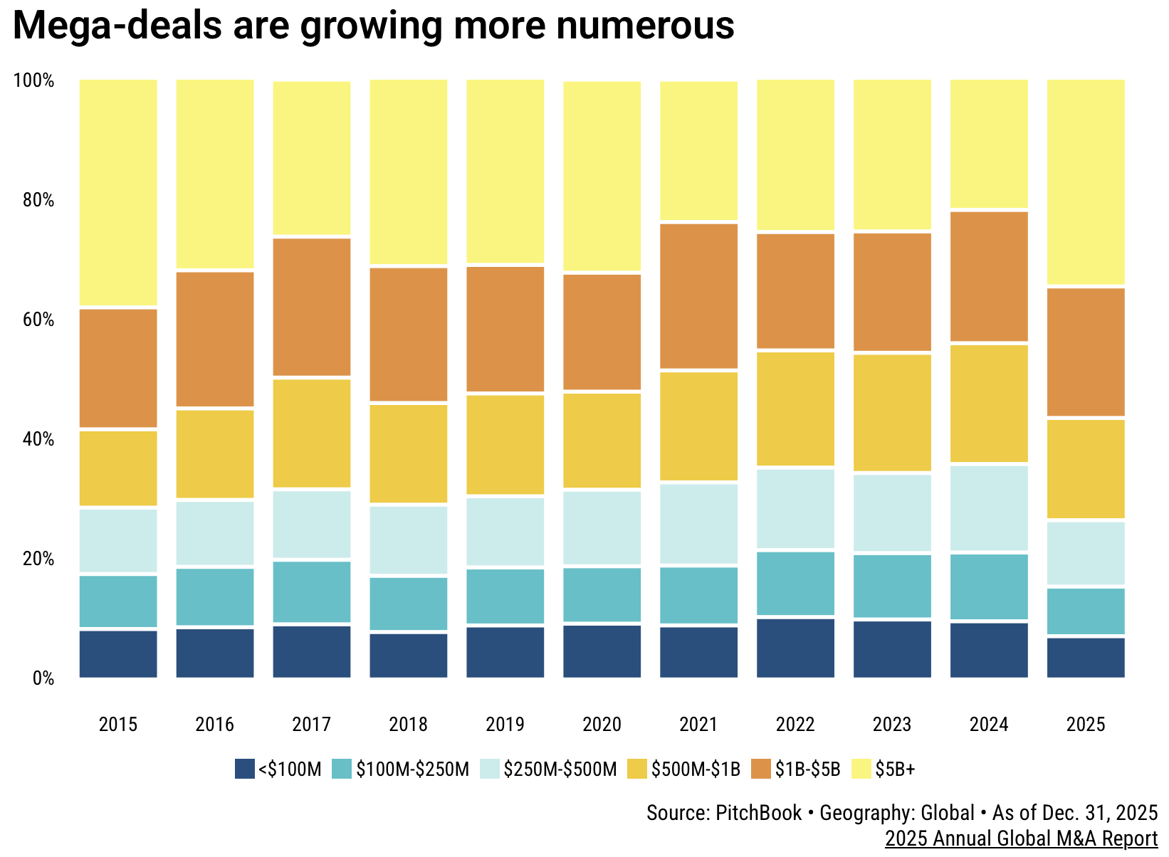 Private-market dealmaking rebounded in 2025, reaching nearly $5 trillion across 50,000+ global M&A transactions, but activity remained highly concentrated in mega-deals. Deals $1B+ made up over half of total M&A value, despite representing only 1.5% of deal count, and the number of mega-deals rose 28% year-over-year while smaller transactions lagged