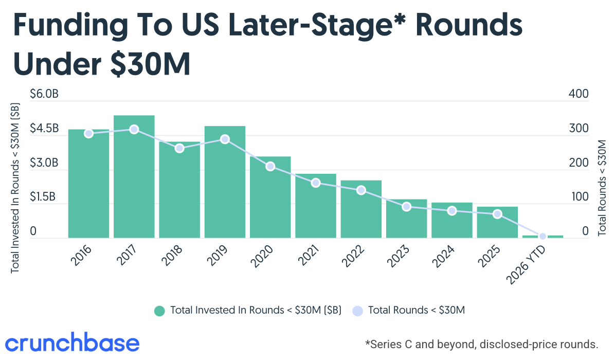 Late-stage startup funding is increasingly concentrated in mega-rounds, leaving smaller late-stage raises ($30M and under) squeezed out. Crunchbase data shows these smaller Series C+ rounds have declined for six straight years, hitting just $1.36B across 69 U.S. rounds in 2025, under 2% of all late-stage investment. Early 2026 looks even weaker, with these rounds representing roughly 0.2% of late-stage funding so far. The shift reflects investors placing bigger bets on a small number of perceived winners