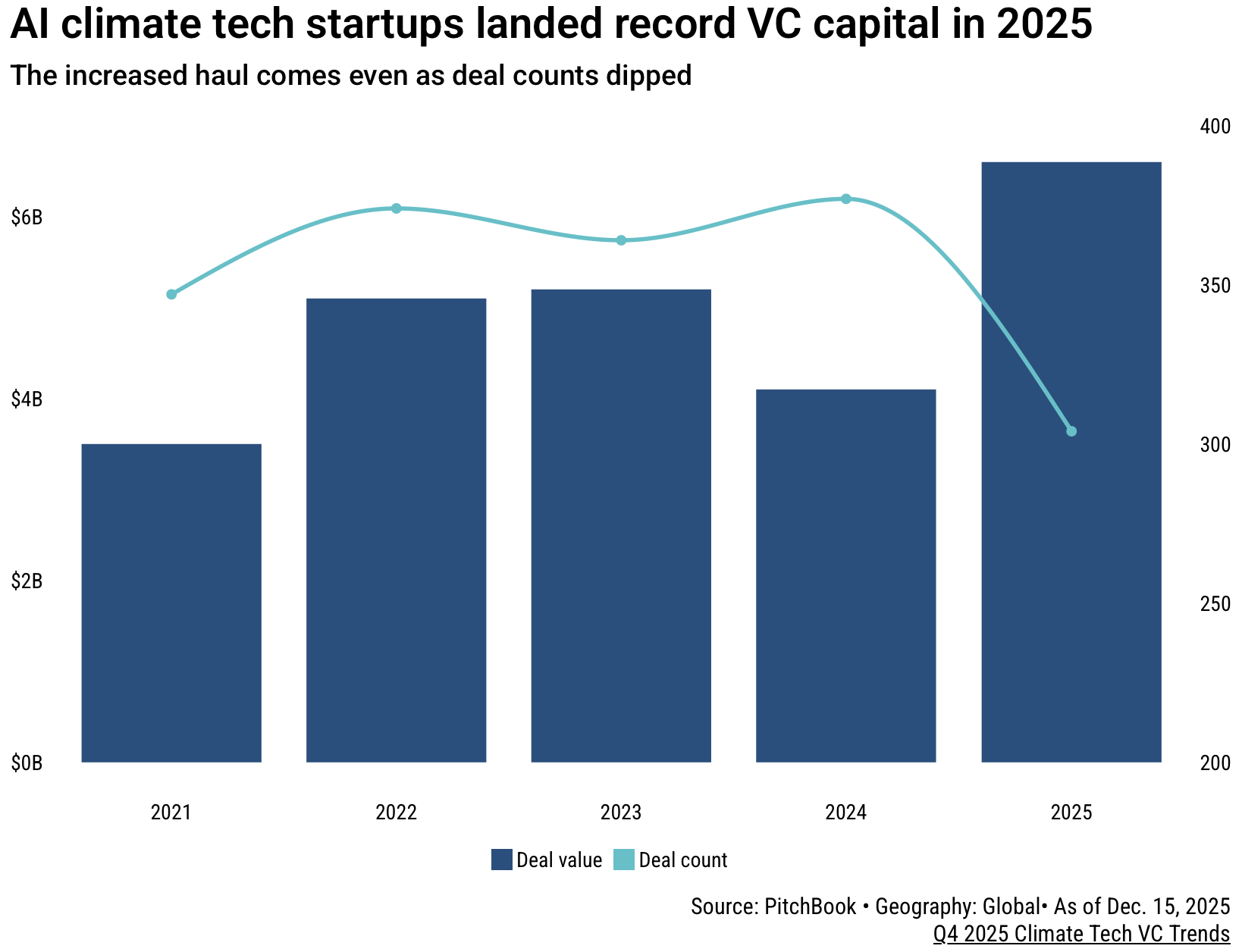 AI climate tech deal value hit an all-time high, even as the number of AI startup deals declined, reflecting the broader shift toward fewer, larger rounds