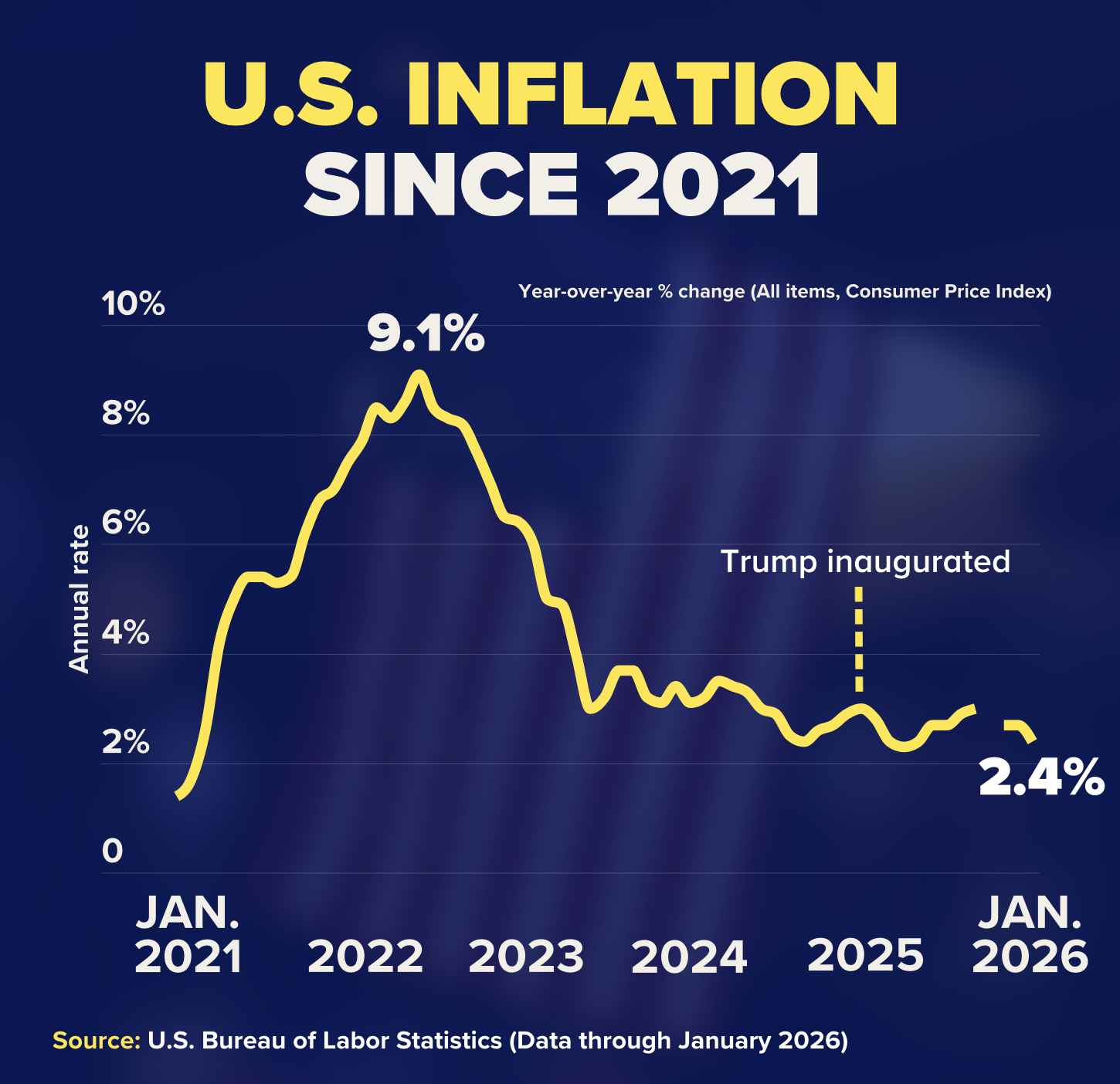 In his State of the Union, President Trump described the economy as strong, while a Reuters/Ipsos poll found that 68% of Americans said they do not believe the economy is booming. Inflation moderated from 3.0% in January 2025 to 2.4% in January 2026, although some essential categories, including electricity (+6.3%), continued to see price increases. Job growth slowed in 2025, with 181,000 positions added over the year, the unemployment rate rising from 4.0% to 4.3%, and much of the hiring concentrated in the health care sector