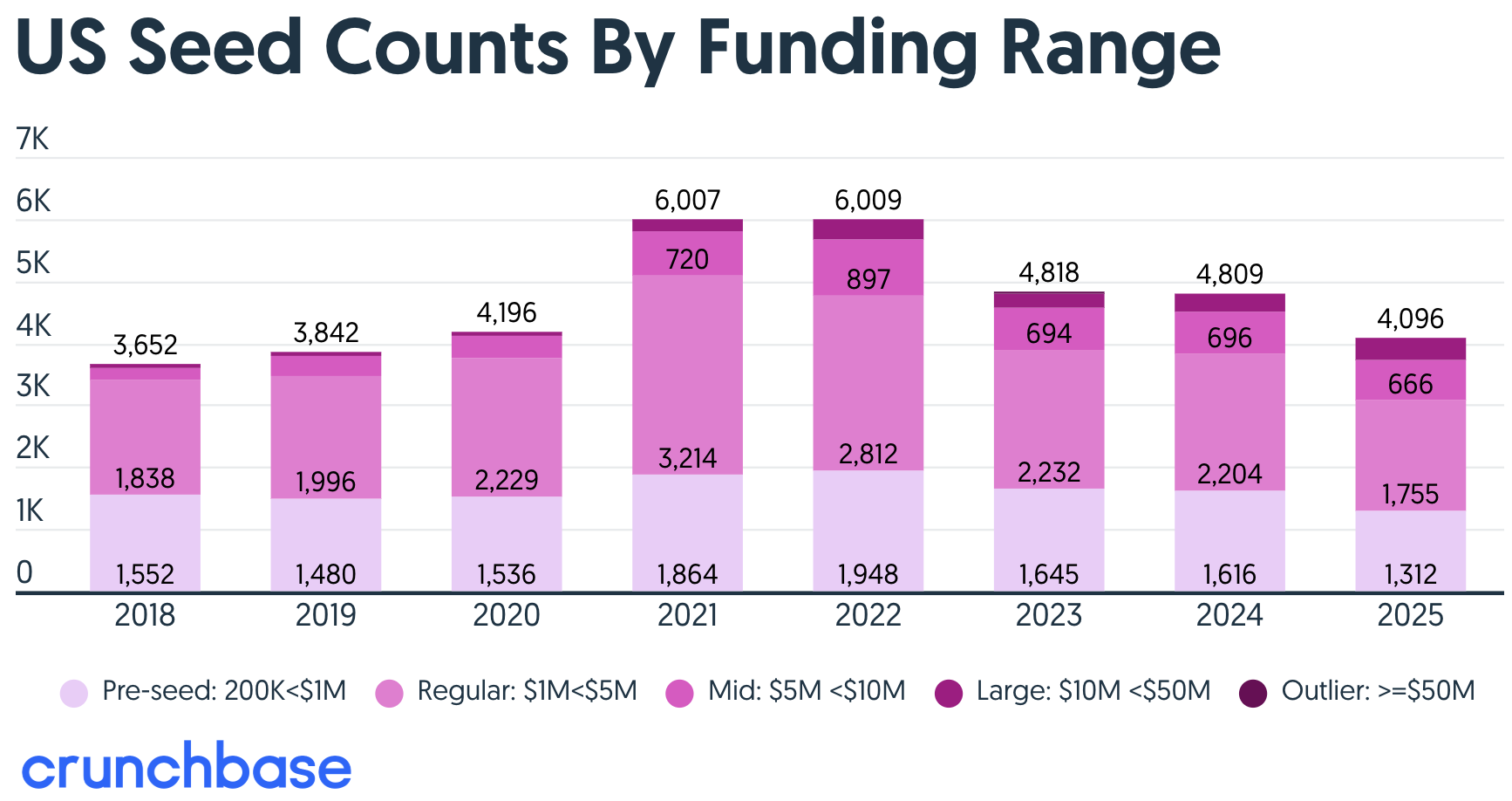 U.S. seed funding reached $19.4B in 2025, but the market has become increasingly bifurcated, with capital concentrating in larger rounds. Smaller seed deals ($200K–$5M) saw ~20% declines YoY, while mid-sized rounds ($5M–$10M) remained flat and larger rounds ($10M+) grew significantly. The share of small deals dropped from 93% (2018) to 75% (2025), while large seed rounds ($10M+) rose from 2% to 9% (~360 deals)