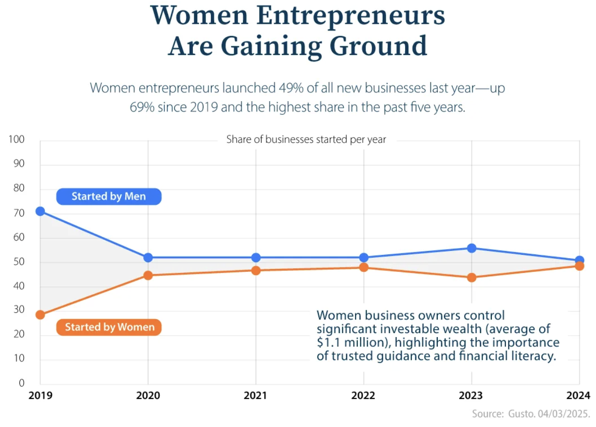 Women are playing a growing role in investing, driven by rising entrepreneurship, income, and wealth. They now launch 49% of new U.S. businesses (up 69% since 2019) and control increasing levels of capital, with average assets of ~$1.1M among women business owners. Their influence is set to expand significantly: women’s share of U.S. wealth is projected to grow from 31% ($10T) in 2018 to 38% ($34T) by 2030, with nearly 25% of affluent households ($250K+ assets) led by married female breadwinners