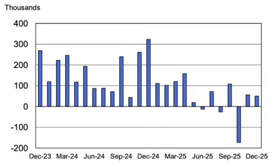 Nonfarm payroll employment over-the-month change, seasonally adjusted, December 2023-December 2025. Source: Bureau of Labor Statistics. (2026, January 9). The employment situation — December 2025 (USDL-26-0020) [PDF]. U.S. Department of Labor. https://www.bls.gov/news.release/pdf/empsit.pdf