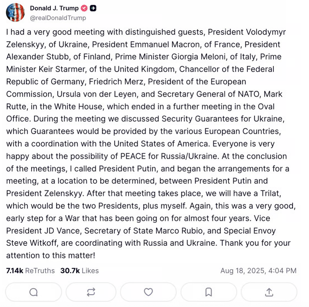 President Trump announced on Truth Social that he had met with Ukrainian President Volodymyr Zelenskyy and several European leaders, including representatives from France, Italy, Finland, the United Kingdom, Germany, the European Commission, and NATO (Truth Social, 2025).