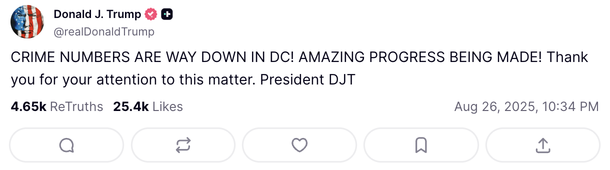 In a recent Truth Social post, President Trump claimed a crime reduction in Washington, D.C., following a National Guard deployment (Truth Social, 2025). CBS News’ analysis supports a significant drop in violent crime, burglaries, and car thefts—nearly 50% declines in some categories—during the roughly three weeks following the deployment (Aug. 7–25) (CBS News, 2025).